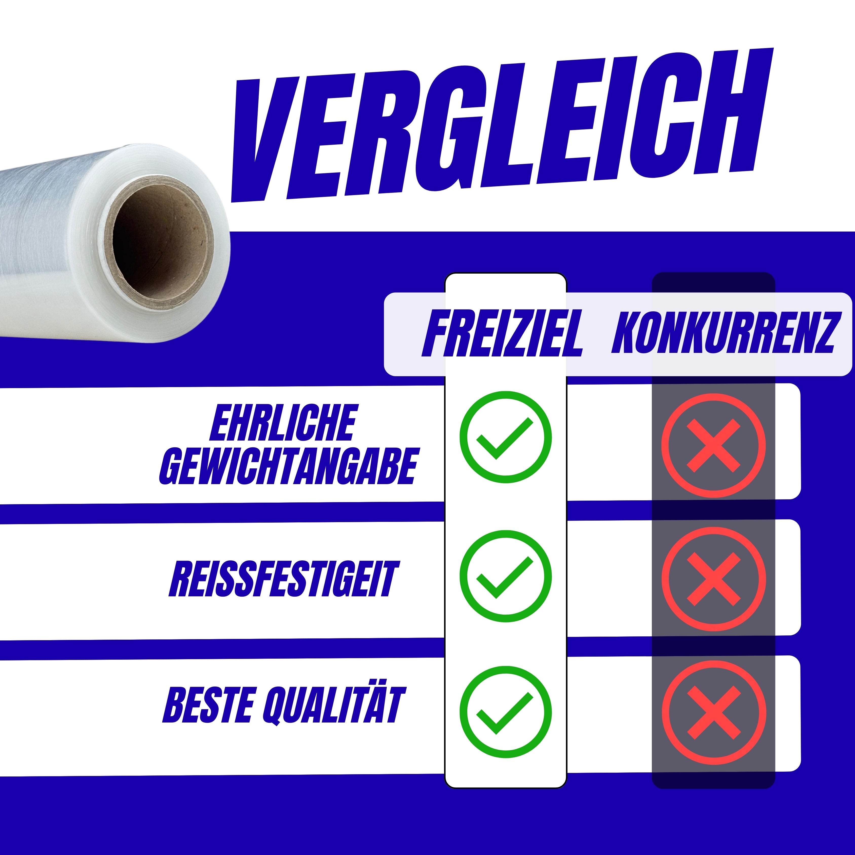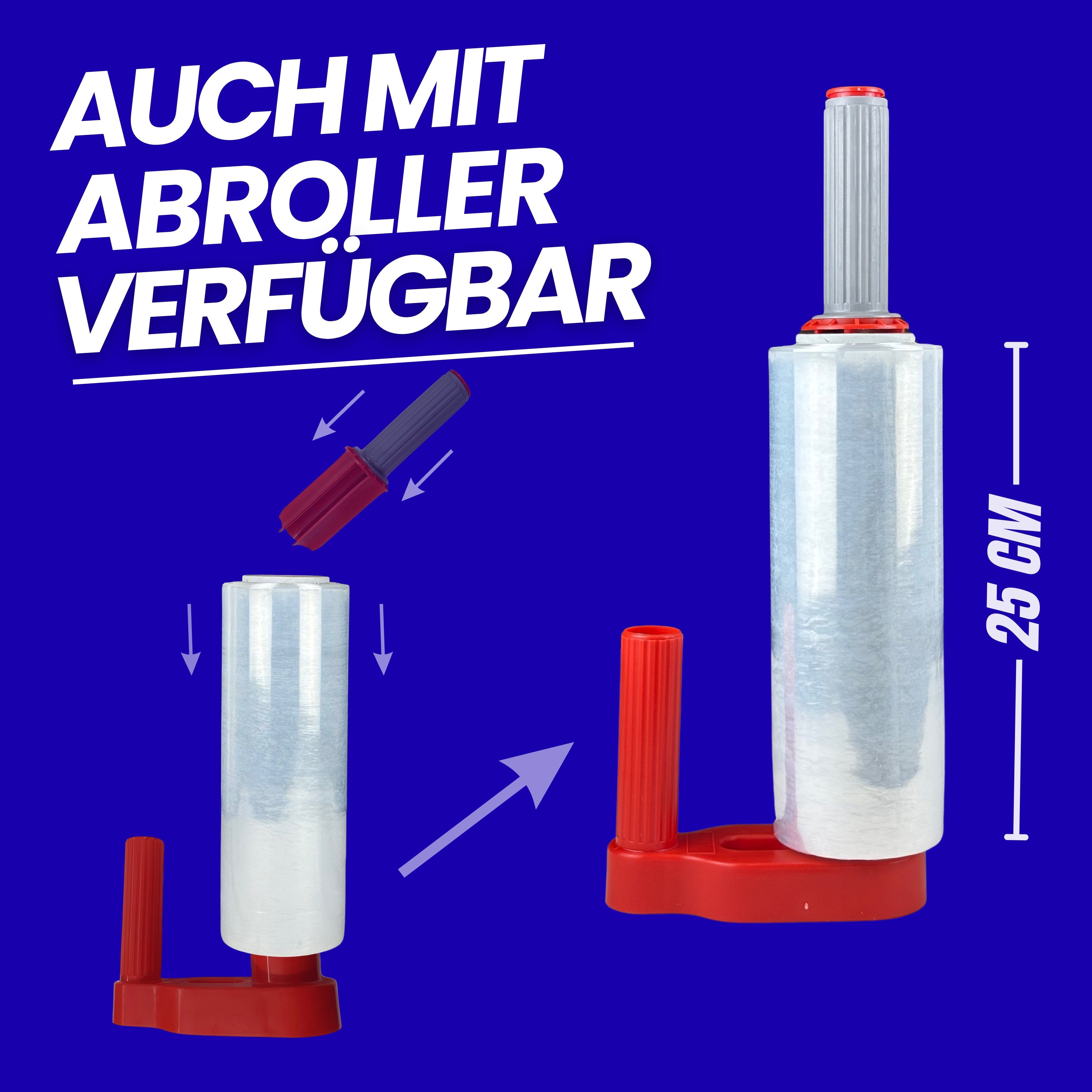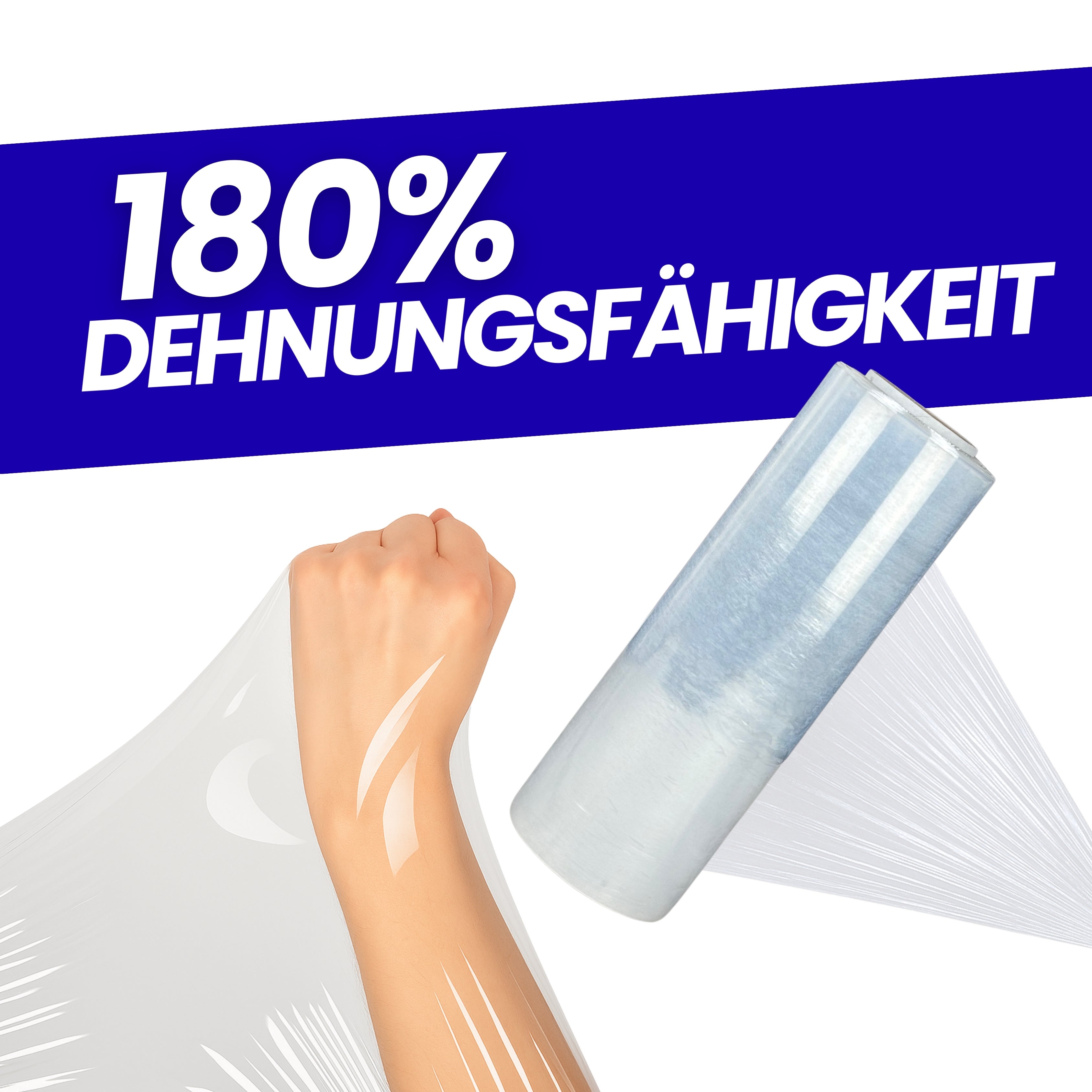 Premium Stretchfolie – Extra stark & effizient Unsere hochwertige Stretchfolie bietet maximale Sicherheit und einfache Handhabung. Mit einer Stärke von 23my, einer Folienlänge von 250 m und einem Gewicht von 900 g pro Rolle ist sie die ideale Lösung für Versand, Lagerung und Transport. Dank der 180 % Dehnungsfähigkeit holst du mehr aus jeder Rolle heraus: Ohne Dehnung: 150 m Leicht gedehnt: 233 m Mittel gedehnt: 294 m Stark gedehnt: 397 m Die bessere Rückdehnung (Memory-Effekt) sorgt dafür, dass deine Waren auch nach Transportbewegungen zuverlässig gespannt bleiben. Zudem ist die Folie UV- & wetterbeständig, hoch reißfest und auch mit Abroller verfügbar. ✔ Ehrliche Gewichtsangabe ✔ Maximale Sicherheit ✔ Beste Qualität für Profis